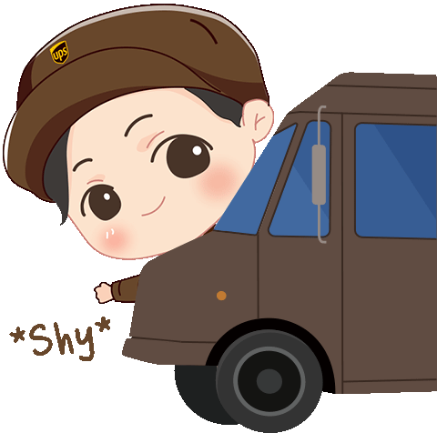 A cute chibi UPS delivery person peeks shyly from behind a brown delivery truck, blushing with a timid expression.