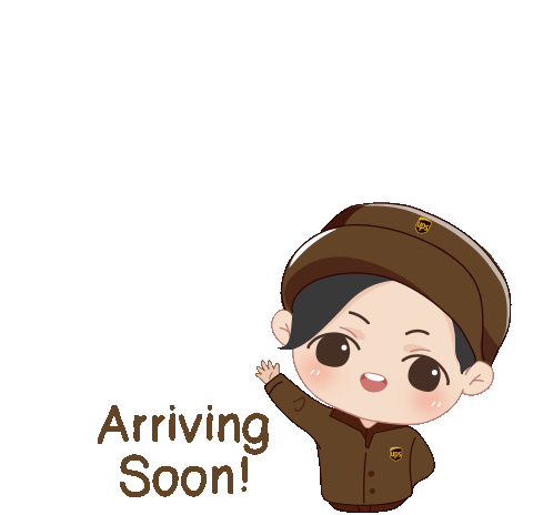 A cute UPS delivery person waves as a drone delivers a package with the text "Arriving Soon!".