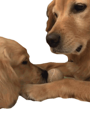 An adult golden retriever, looking annoyed, gently snarls at a smaller puppy, holding a tennis ball between them.