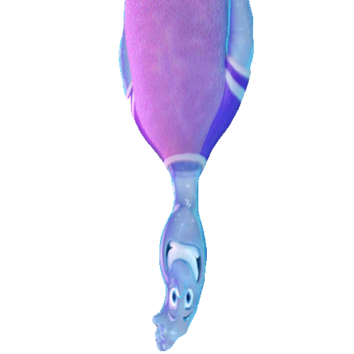 Wade, the water elemental from Pixar, smiles cheerfully while hanging upside down in his pink and purple outfit.