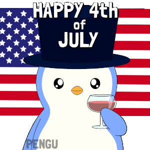 Pengu the penguin celebrates the 4th of July, wearing a top hat and toasting with a glass of wine against an American flag.