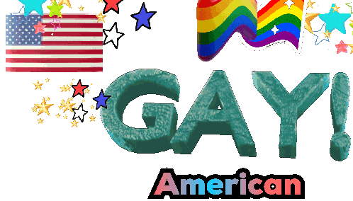 An animated sticker featuring the word 'American' in a rainbow gradient, accompanied by a waving rainbow flag and an American flag.