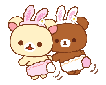 Two adorable cartoon bears, one light and one dark, wear bunny ears and tails, bouncing playfully.