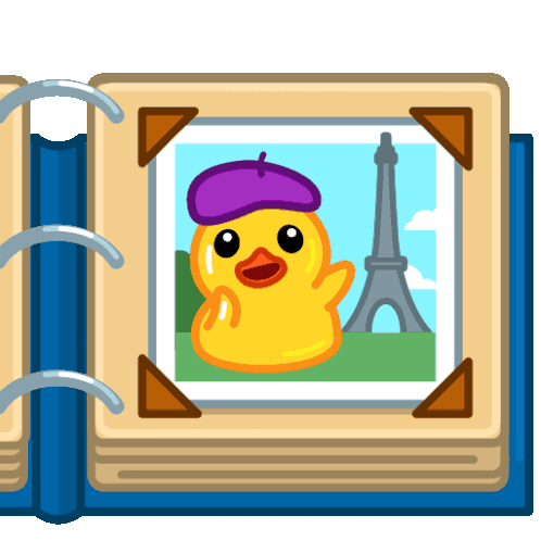 Utya the duck enjoys a tropical beach, skis down snowy slopes, and visits the Eiffel Tower in Paris, showcasing fun travel adventures.