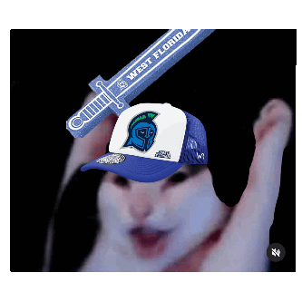 An excited white cat with its mouth open, wearing a blue and white "West Florida" cap and holding a "West Florida" foam sword.