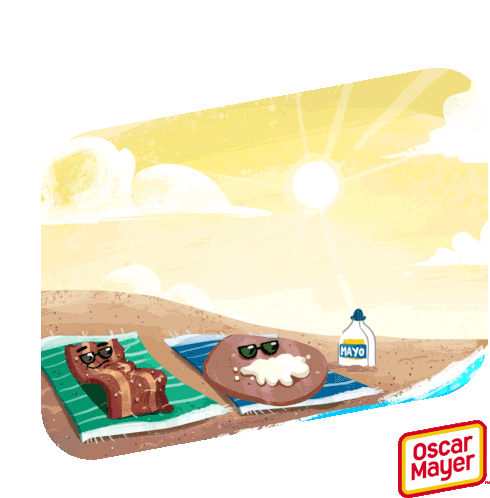 An Oscar Mayer bacon strip and a potato character relax on beach towels under the sun, enjoying vacation time.