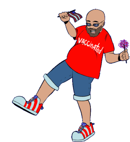 A happy vaccinated man dances with an American flag and a sparkly pom-pom, celebrating the 4th of July.