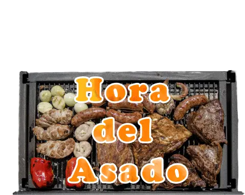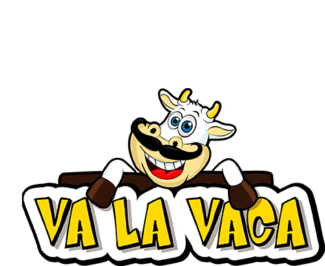 A cheerful cartoon cow with a mustache peeks over a banner displaying 'VA LA VACA', representing a lively parrilla (grill) brand.
