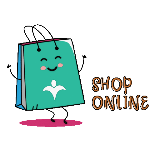A cheerful animated shopping bag with a happy face, arms, and legs dances next to the words "SHOP ONLINE," promoting online shopping.