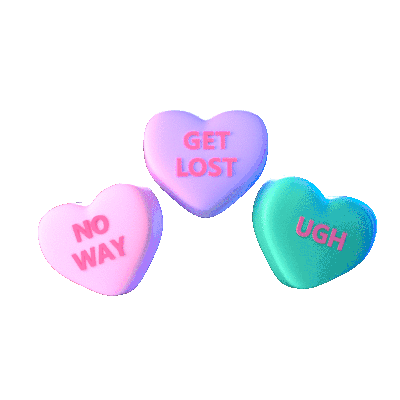 Three pastel candy hearts with sarcastic messages: 'NO WAY', 'GET LOST', and 'UGH', perfect for anti-Valentine's Day.