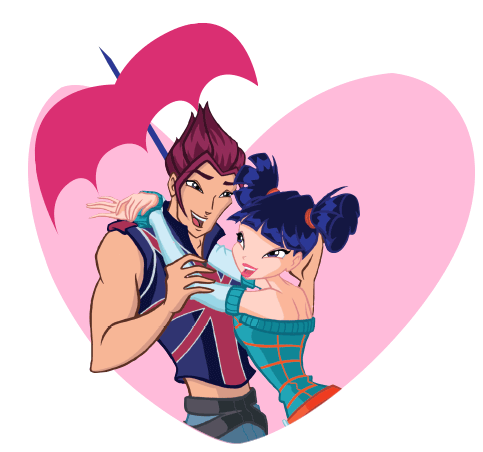 Musa and Riven from Winx Club share a loving embrace, surrounded by hearts, perfect for Valentines Day.