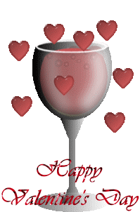 A festive animated sticker featuring a wine glass filled with red liquid and floating hearts, wishing 'Happy Valentine's Day'.