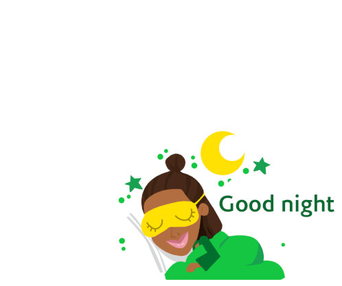 Valid Mouka character sleeping peacefully with a yellow eye mask, surrounded by stars and a crescent moon, wishing 'Good night'.