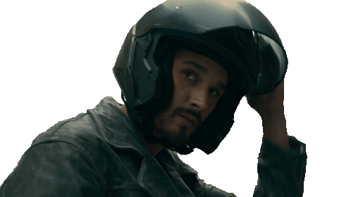 Joel Sánchez (Bruce) puts on a motorcycle helmet, looking directly at the camera. Ready to ride.