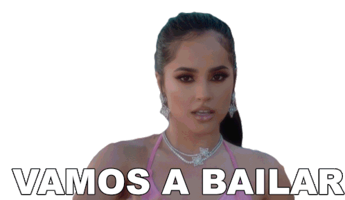 Becky G inviting to dance with 'Vamos A Bailar' text, moving her hand to the rhythm, ready for a party.