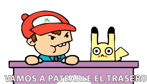 A determined Pokemon Trainer and Pikachu are ready for battle, with the Spanish phrase 'Vamos a patearle el trasero'.