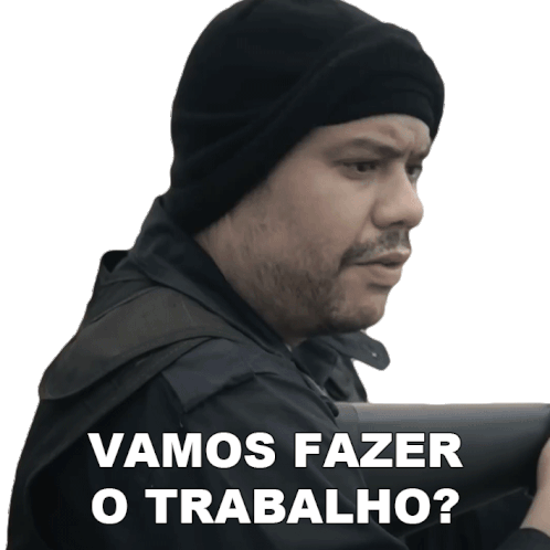 Pedro Benavides from Porta Dos Fundos asks 'Vamos Fazer O Trabalho?' (Shall we do the job?) with a determined look.