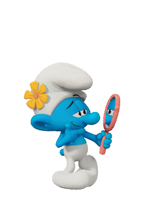 Vanity Smurf admires his reflection in a small mirror, showing off his charming expressions from The Smurfs Movie.