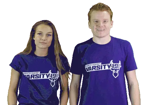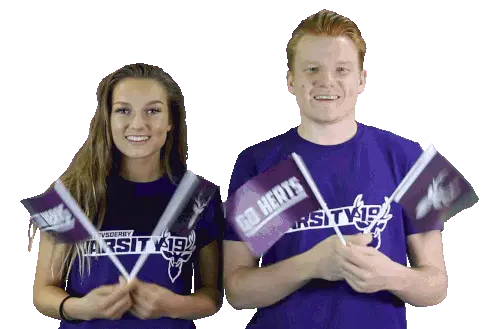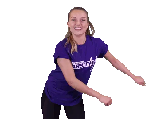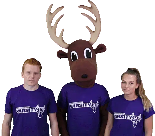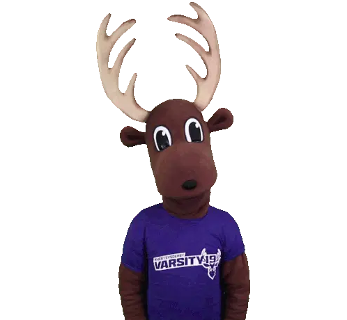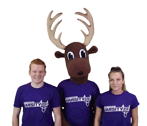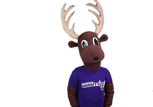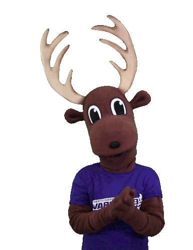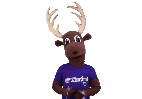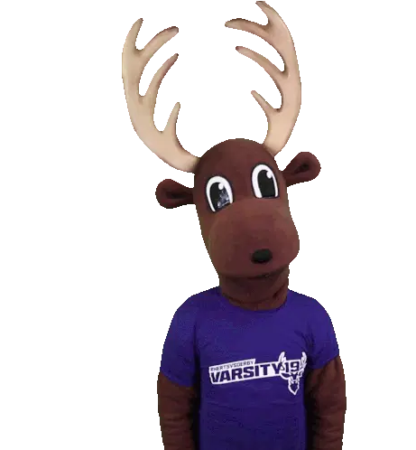 Stanley The Stag, the Goherts mascot, claps slowly at Varsity19, showing support with a purple shirt.