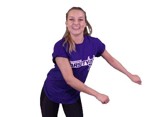 A young woman from Varsity19 Goherts performs an energetic floss dance, smiling brightly and having fun.