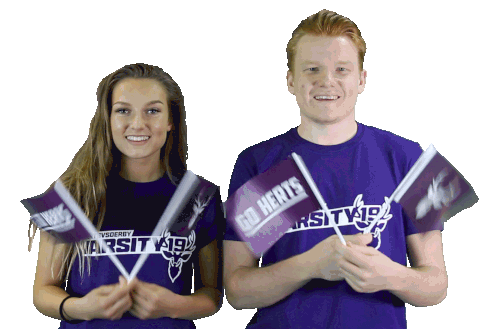 Two smiling students, a man and a woman, wave "Goherts" and "Varsity19" flags for Herts Vs Derby.