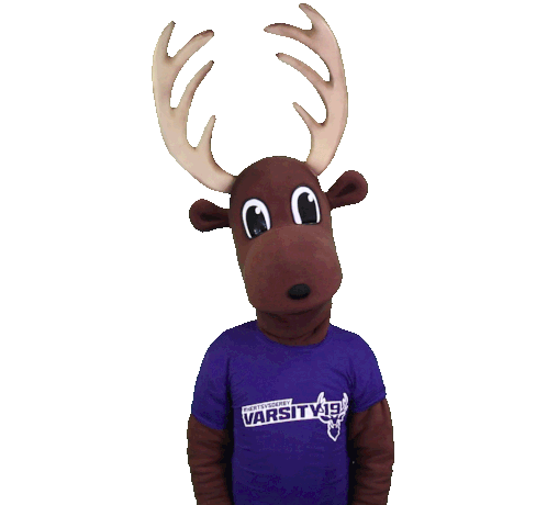 a stuffed deer wearing a purple shirt that says varsity19