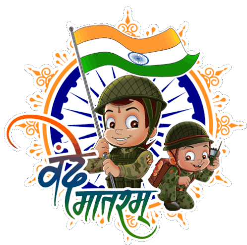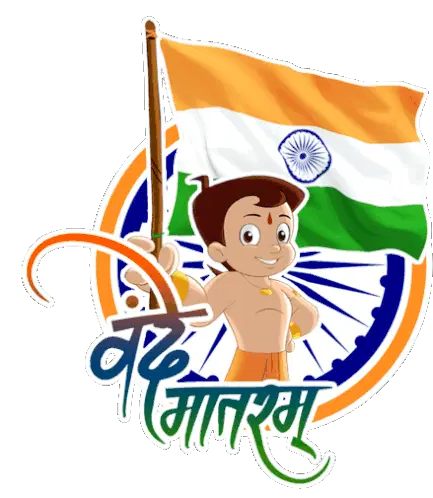 Chhota Bheem and Raju as patriotic soldiers holding the Indian flag, celebrating India with 'Vande Mataram'.