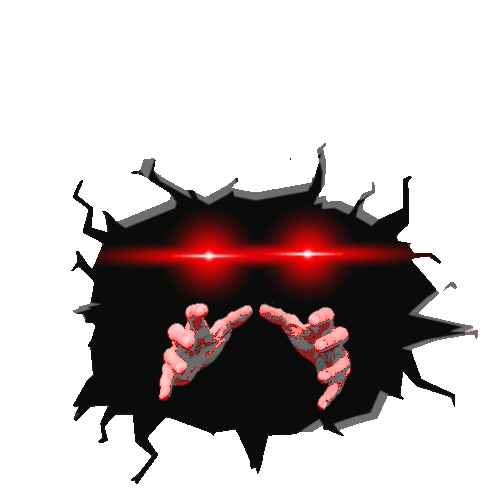 Vedal Neuro's void creature with glowing red eyes and pixelated hands emerges from a cracked wall, briefly revealing a small head.