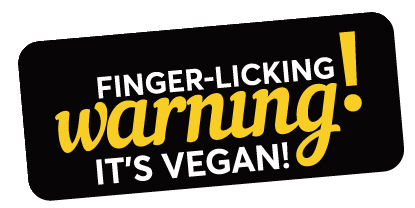 A bold warning sticker declaring "Finger-Licking Warning! It's Vegan!" for delicious plant-based food.