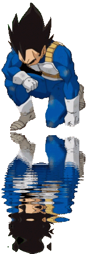 Vegeta from Dragon Ball Z kneels, looking at his rippling reflection in water, showcasing his iconic blue Saiyan armor.