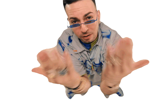 Justin Quiles makes an inviting 'come here' gesture with both hands, wearing blue sunglasses and rings.