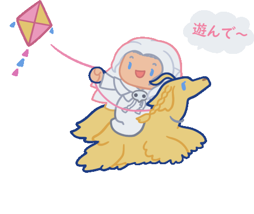 Venat Ancient happily playing with a kite while riding on her loyal dog, Argos, inviting others to join the fun.