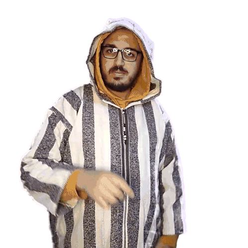 Man in a striped hooded garment makes a beckoning 'come here' gesture, then covers his face.