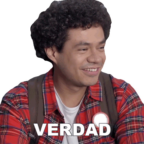 A smiling man in a red plaid shirt with the word 'VERDAD' (Truth) written on it, looking amused.