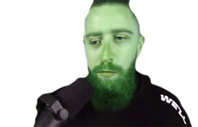 A green-faced man with a beard expresses disgust or nausea while speaking into a microphone.