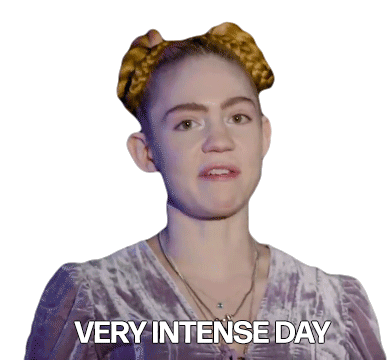 Grimes saying 'Very Intense Day' with a thoughtful and slightly stressed expression.