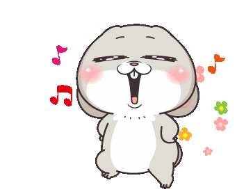 Very Miss Rabbit, a cheerful gray character with rosy cheeks, sings loudly, surrounded by musical notes and flowers, expressing pure joy.
