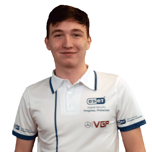 Tomas Koreny, representing VGP Virtual GP, smiles confidently in his ESET branded polo shirt with arms crossed.