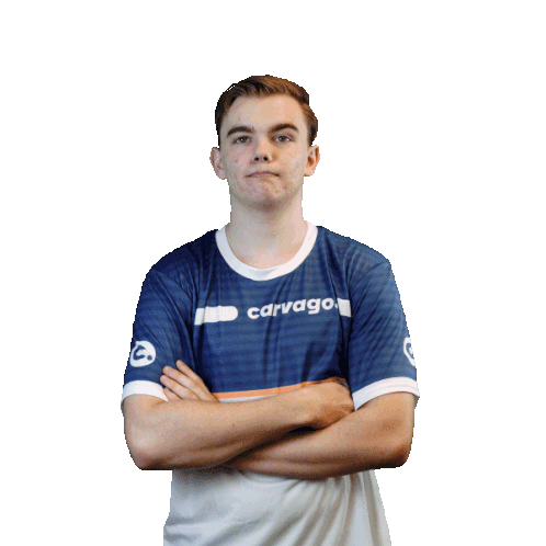Esports player Petr Hermoch in his VGP Virtual GP team jersey, pointing down with a confident expression.