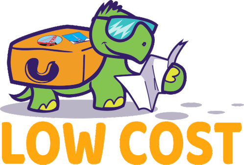 A cheerful cartoon turtle with sunglasses and a suitcase, holding a map, promoting low-cost travel with 'LOW COST' text.
