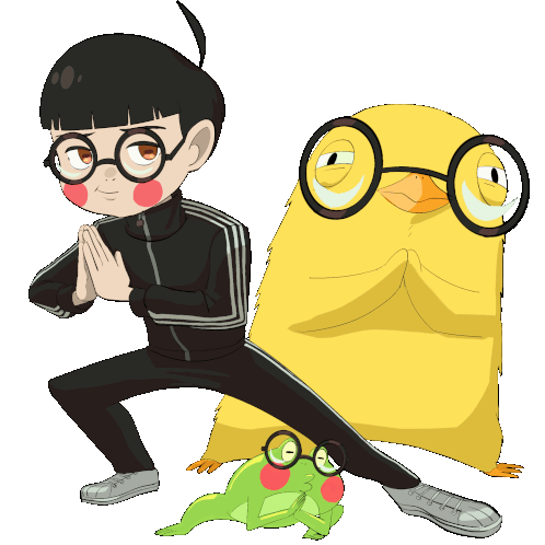 A cartoon boy, yellow duck, and green frog, all wearing glasses, perform a synchronized vibe check pose.