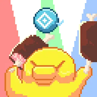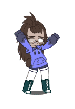 An animated Gacha Club character, a girl with glasses and a blue hoodie, vibing with arms raised in a relaxed pose.