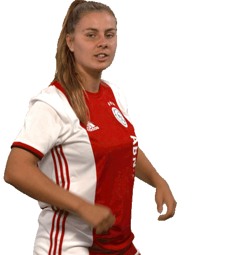 Victoria Pelova of Ajax Vrouwen celebrates with a distinctive dance, pulling on her red and white team jersey.