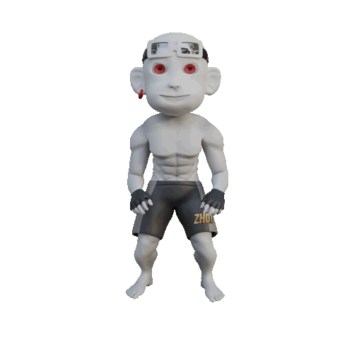 A muscular 3D cartoon character wearing 'ZHOU' shorts raises arms in a triumphant victory pose, celebrating success.