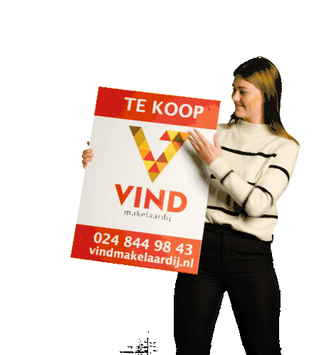 A woman and man from Vind Makelaardij celebrate a successful sale, changing a 'For Sale' sign to 'Sold'.