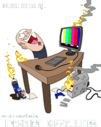 Vinesauce Joel experiences technical difficulties with his computer on fire, headbanging on the desk. A humorous sticker for relatable tech woes.