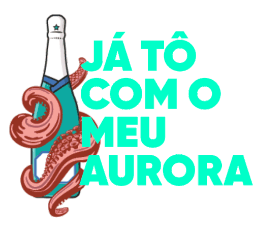 An animated sticker for Vinícola Aurora, featuring a sparkling wine bottle with octopus tentacles and the text "JÁ TÔ COM O MEU AURORA".
