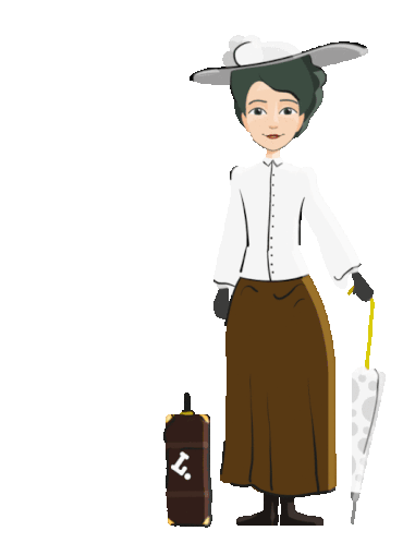 A charming vintage woman, dressed in a hat and long skirt, stands with her suitcase and umbrella, ready for an elegant adventure or trip.