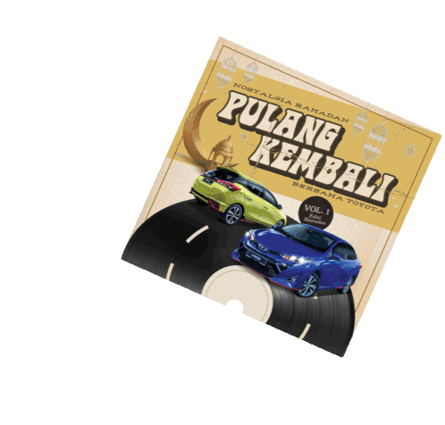 Animated sticker featuring a vinyl record with Toyota Yaris and Vios cars, celebrating Ramadan nostalgia and the journey home.