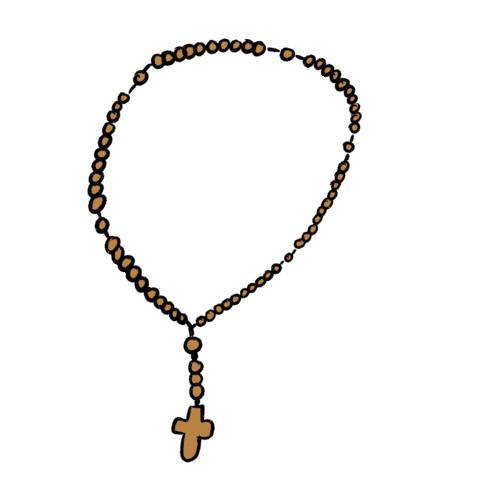 An animated cartoon rosary forms a heart shape, with a cross dangling below, symbolizing prayer and devotion.